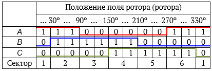 Датчик положения ротора имеет три канала. Каждый канал выдаёт за один период электрического