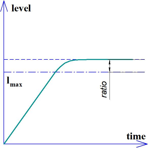 При включении опции "Учитывать переполнение" жидкость, достигая максимального значения (lmax), начинает вытекать из бака через порт "Т". При этом параметр ratio определяет относительную высоту перелива (Рисунок 2):