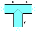 Для определения расхода в ответвлениях тройника применяются выражения, аналогичные зависимостям, используемым в блоке Гидравлический регулируемый дроссель (пункт "2. Параметризация на основе коэффициентов гидравлического сопротивления по справочнику Идельчика"). Расчет потерь давления в тройнике осуществляется на основе коэффициентов сопротивления для ламинарной Klam и турбулентной Kturb областей. Коэффициент сопротивления в турбулентной области течения Kturb для прямого и бокового ответвлений зависят от направления потока и отношения их площадей проходного сечения и определяются на основе табличных данных из справочника Идельчика [1].