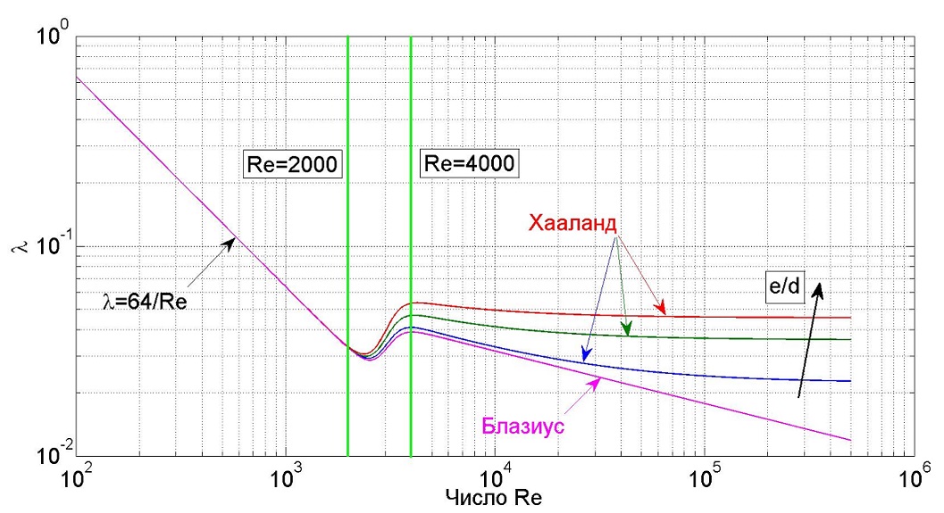 Следует обратить внимание, что аппроксимация Хааланда учитывает влияние шероховатости внутренней стенки трубопровода, а формула Блазиуса справедлива только для гладких трубопроводов.