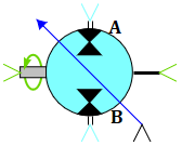 Блок реализует модель гидравлической машины, функционирующей в режиме насоса/мотора c регулируемым рабочим объемом. Блок может быть использован для моделирования объемных гидропередач. Наличие двух механических портов (вал и корпус) позволяет встраивать блок в различные механические конструкции, например, для моделирования упруго закрепленного корпуса. Имеется возможность учитывать объемные потери (опционально). Учитывается влияние насоса/мотора на тепловые характеристики потока. В уравнении теплового баланса дополнительно учитывается энергия, знак которой зависит от того, в каком режиме работает гидравлическая машина. Если гидравлическая машина работает как насос, то энергия подводится из окружающей среды, и наоборот, если гидравлическая машина работает как мотор, то происходит отвод энергии из жидкости в окружающую среду. При положительной частоте вращения вала принимается течение жидкости от порта "A" к порту "B".