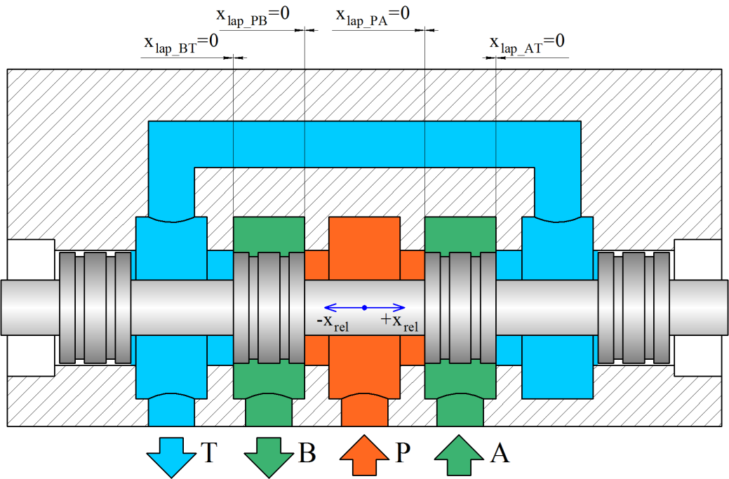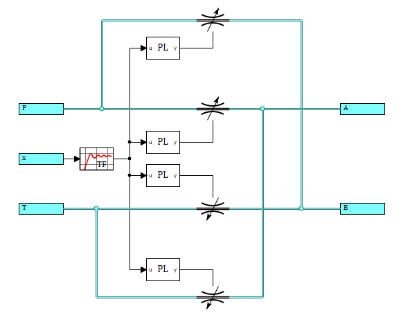 В основе блока лежит модель гидравлического регулируемого дросселя. Блок "TF" позволяет учесть динамические свойства распределителя, которые моделируются на основе типового звена второго порядка. С помощью блоков Язык программирования учитывается положительное, отрицательное или нулевое перекрытие каналов P-A, P-B, A-T и B-Т.