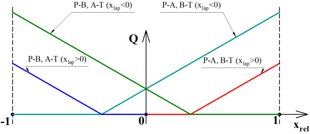 Если при настройке блока для каналов Р-B или A-T установлена положительная величина в свойстве "Перекрытие проходных каналов (-100≤x_lap≤100), %", то пропускная способность этих каналов при изменении положения золотника распределителя меняется в соответствии с синей линией. Если для этих же каналов устанавливается отрицательное перекрытие, то пропускная способность этих каналов при изменении положения золотника распределителя меняется в соответствии с зеленой линией.