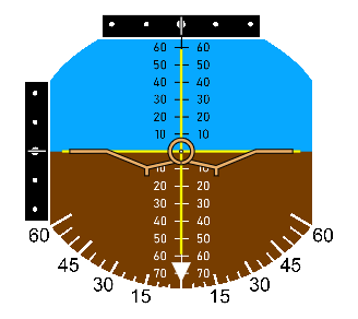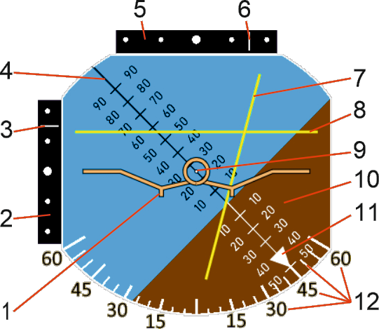 В блоке значение угла тангажа определяет величину перемещения подвижной шкалы тангажа (поз. 10 Рисунок 1) в направлении вверх-вниз вдоль линии вертикали (поз. 4 Рисунок 1), а значение угла крена определяет величину угла поворота линии вертикали относительно центральной точки (поз. 9 Рисунок 1). Угол тангажа определяется по шкале тангажа относительно центральной точки при любом угле крена. По голубой зоне шкалы тангаж отсчитывается в положительную сторону, по коричневой зоне шкалы — в отрицательную.