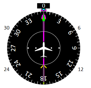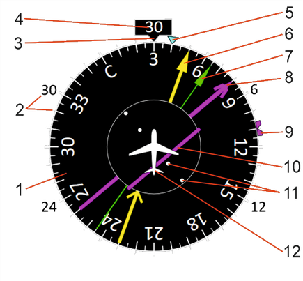 Значение заданного путевого угла в блоке определяет угол поворота стрелки заданного путевого угла (поз. 8 Рисунки 1, 2, 3) относительно подвижной шкалы курса (поз. 1 Рисунки 1, 2, 3, 4).