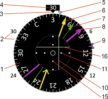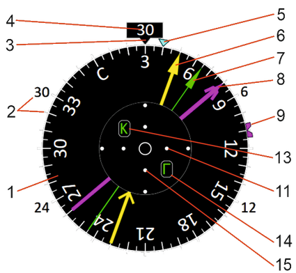 - Неподвижная шкала отсчета курсового угла радиостанции (КУР) автоматического радиокомпаса и курсового угла радиомаяка (КУРМ) радиотехнической системы ближней навигации