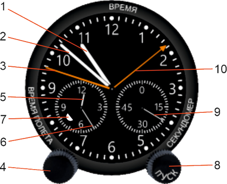 Астрономическое время отображается с помощью часовой (поз. 1 Рисунок 1), минутной (поз. 2 Рисунок 1) и секундной (поз. 3 Рисунок 1) стрелок. Время полета отображается с помощью часовой (поз. 5 Рисунок 1) и минутной (поз. 6 Рисунок 1) стрелок. Секундомер имеет минутную (поз. 9 Рисунок 1) и секундную (поз. 10 Рисунок 1) стрелки.