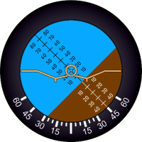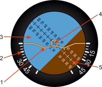 Угол тангажа определяется по шкале тангажа относительно центральной точки при любом угле крена. По голубой зоне шкалы тангаж отсчитывается в положительную сторону, по коричневой зоне шкалы — в отрицательную.