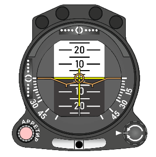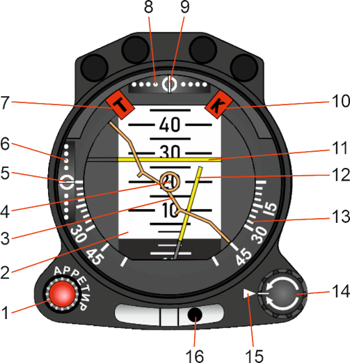 Угол крена определяется по положению силуэта самолета относительно неподвижной шкалы крена. При правом (положительном) крене силуэт самолета поворачивается вправо, как показано на рисунке (Рисунок 1), при левом (отрицательном) крене силуэт самолета поворачивается влево.