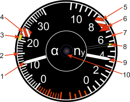 Индекс зоны предельно допустимых значений угла атаки (поз. 3 Рисунок 1) указывает о приближении к границе зоны недопустимых значений угла атаки (поз. 4 Рисунок 1). Индексы 3 и 4 перемещаются вместе, положение границы между ними настраивается с помощью свойства "Максимально допустимый угол атаки, град".