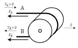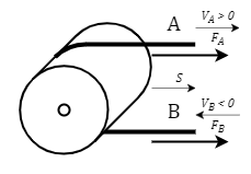 Блок позволяет изменять направление движения концов ремня и знак силы натяжения ремня. Движение концов ремня в одну сторону означает, что скорости концов ремня будут иметь одинаковые знаки. Знак силы натяжения ремня указывает, в каком случае сила на порте "A" будет считаться силой натяжения ремня. В таблице (Таблица 1) схематично отображены способы подключения шкива к другим блокам. Вектор S указывает положительное направление отсчета векторов скоростей v и сил F. Векторы vA и vB отображают совпадение или несовпадение знаков скоростей концов ремня.
