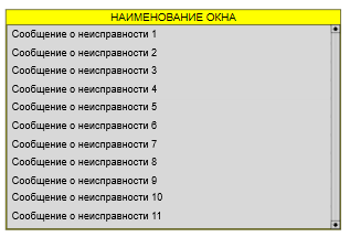 | Список сообщений | ListMsg | Массив строк сообщений о неисправностях, построчно выводимых в окне. Допустимо разделять сообщения символом точки с запятой. При выборе строчки, она выделяется синим цветом | Сообщение о неисправности 1…16 | Текст |