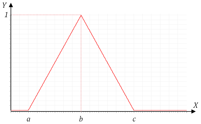 диапазоне значений входа: Y(x) = 0, если x ≤ a; Y(x) = (x - a)/(b - a), если x > a и x ≤ b; Y(x) = (c - x)/(c - b), если x > b и x ≤ c; Y(x) = 0, если x ≥ c |