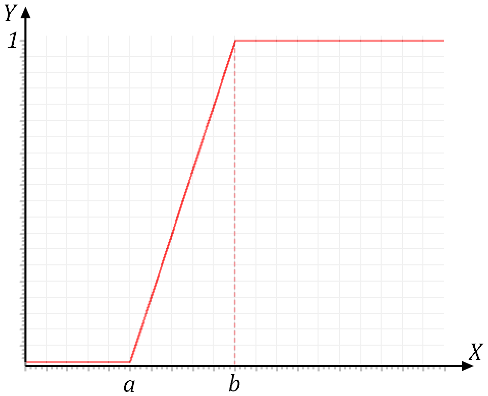 b: Y(x) = 0, если x ≤ a; Y(x) = (x - a)/(b - a), если x > a и x ≤ b Y(x) = 1, если x ≥ b |
