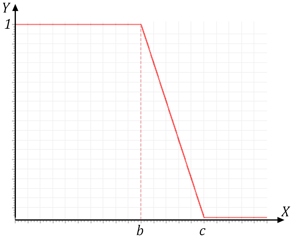 с: Y(x) = 1, если x < b; Y(x) = (c - x)/(c - b), если x > b и x ≤ c; Y(x) = 0, если x ≥ c |