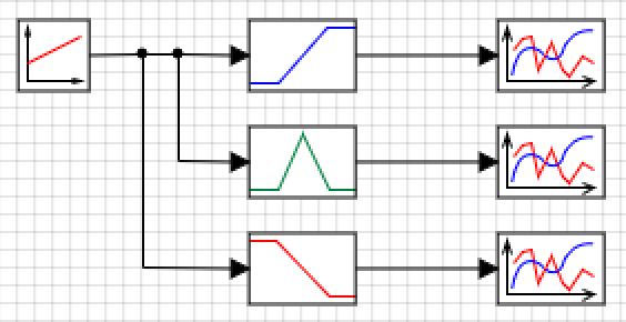 По входной значению входа и заданными параметрам происходит расчет вектора значений функций принадлежности. Функции принадлежности рассчитываются по следующей схеме:
