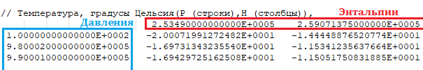 Все теплофизические свойства являются функциями давления [Па] и энтальпии [Дж/кг]. Причем давления откладываются по строкам таблицы, а энтальпии – по столбцам (Рисунок 2). Пользователь имеет возможность формировать таблицу, состоящую из неограниченного количества строк и столбцов.
