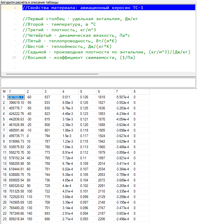 Все теплофизические свойства являются функциями энтальпии [Дж/кг]. Причем энтальпии откладываются по строкам таблицы. Пользователь имеет возможность формировать таблицу, состоящую из неограниченного количества строк.