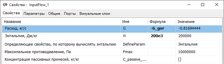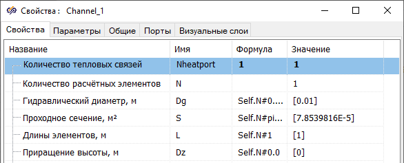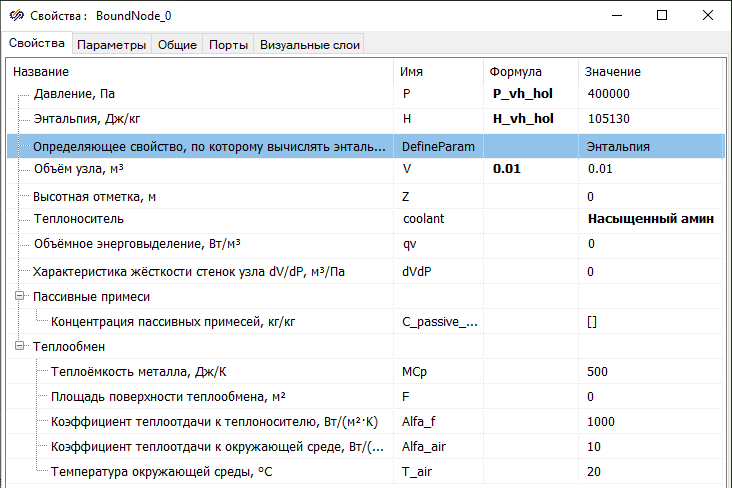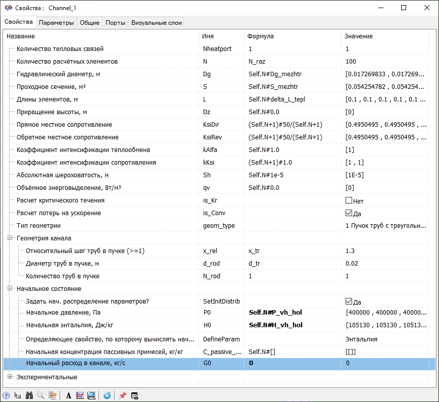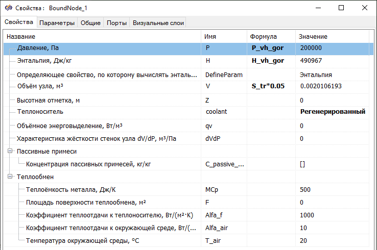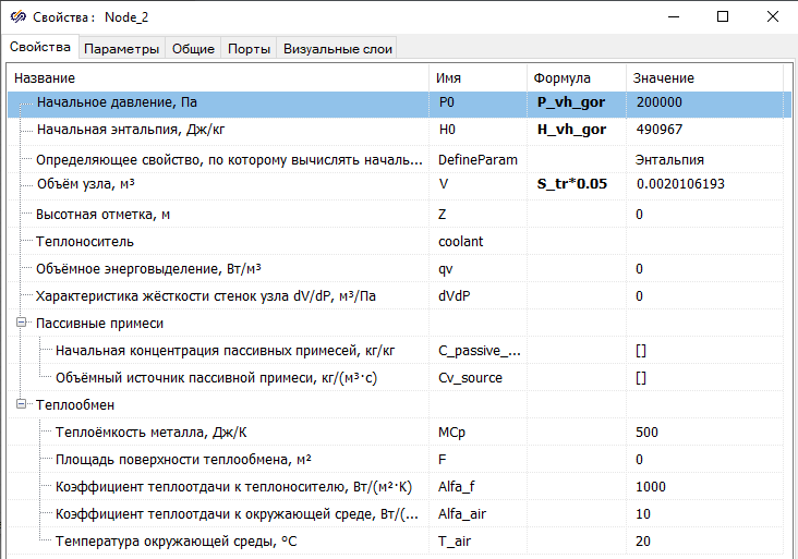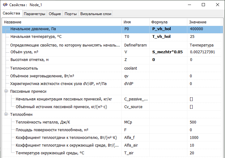 Значение начальной энтальпии в свойствах внутреннего и граничного узлов не играет роли, так как в качестве определяющего параметра выбрана "Температура". Объем же узла указывается, как произведение площади сечения на длину узла, условно принятую за 5 см. Запись "S_mezhtr*0.05" означает, что вместо нее будет подставлено значение переменной с именем "S_mezhtr" (проходное сечение канала). Тип теплоносителя достаточно указать в одном из узлов, так как узлы топологически связаны между собой каналом.