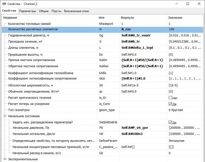 Согласно описанию математической модели, реализованной в теплогидравлическом коде HS, расчетный объем трубопровода (т.н. канал) разбивается по длине на задаваемое количество элементарных объемов, параметры внутри которых не имеют пространственного распределения. В связи с наличием такого разбиения, появляется еще несколько параметров расчетной схемы, значения которых нужно задать. Для достижения достаточной детализации распределения параметров по длине трубы, примем количество ее разбиений равным 100.