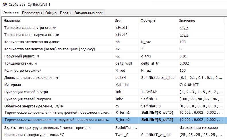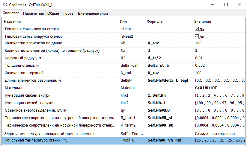 Параметризация блока "HS – Цилиндрическая толстая стенка" происходит так же с применением коэффициентов, заданных в скрипте проекта. Дополнительно в свойствах блока нужно определить материал стенки, который можно выбрать из набора, входящего в комплект SimInTech, расположенного в \SimInTech\Bin\DataBase\Материалы_теплогидравлика\. Значения свойств "Нумерация связей внутри" и "Нумерация связей снаружи" представляют собой массивы из номеров участков внутреннего и наружного каналов, с которыми связаны внутренние и наружные участки стенки. То есть первый участок стенки связан с последним участком холодного канала и с первым участком горячего канала.
