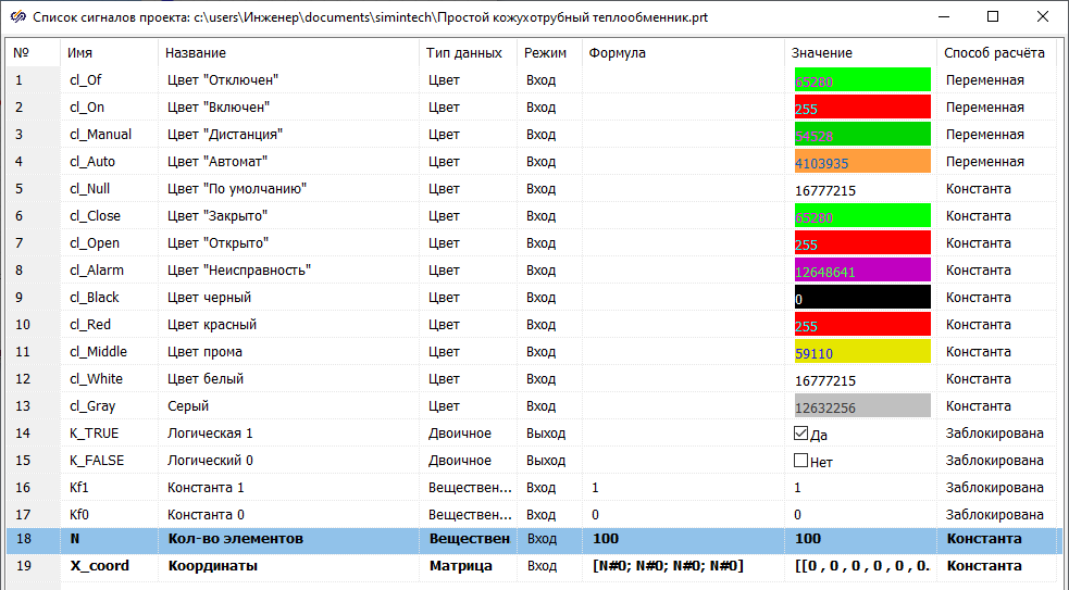 Для того, чтобы иметь возможность использовать массивы для вывода на график (через менеджер данных проекта), необходимо, чтобы они имели статус не просто переменных скрипта, доступных только в составе расчетной схемы, а статус глобальных сигналов проекта. Поэтому сформируем заготовку матрицы X в виде нулевой матрицы в списке сигналов проекта. Для этого откроем окно сигналов проекта с помощью команды "Сервис" → "Сигналы". В открывшимся окне создадим 2 новых сигнала: один вещественного типа, с именем "N" и значением 100, а другой типа "Матрица", с именем X_coord и значением [N#0, N#0, N#0, N#0]. Данная запись означает следующее: в квадратных скобках через запятую перечисляются элементы одномерного массива (вектора). Знак решетки в записи элемента массива означает, что элемент состоит из N чисел, равных нулю. При этом значение N берется из одноимённой, только что созданной, переменной. Нужно отметить, что опцию "Способ расчета" для сигнала X_coord нужно установить в значение "Константа", так как при этом сигнал принимает свое начальное значение только в момент инициализации проекта, а в ходе расчета может переписываться из других источников, в том числе из скрипта. Таким образом матрица X_coord будет состоять из четырех строк, по 100 нулей в каждой.