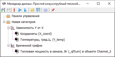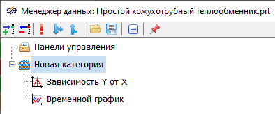 Таким образом, мы получили в дополнение к массиву координат, еще и массив необходимых температур. После этого всё готово для графического представления необходимых параметров. Для этого используем окно менеджера данных, в котором, с помощью кнопок на его панели инструментов, создадим новую категорию, в которой создадим график "Зависимость Y от X", для отображения температур относительно длины теплообменника, а также "Временной график" для отображения зависимости мощности теплообмена от времени.