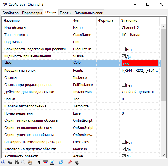 Условимся, что по верхнему, на листе проекта, каналу будет течь более холодный теплоноситель, а по нижнему – более горячий. Для наглядности изменим цвет нижнего канала на красный. Для этого нажмем правой кнопкой мыши по нижнему каналу и выберем в контекстном меню "Свойства объекта". В открывшемся окне, на вкладке "Общие", отредактируем значение свойства "Цвет", придав ему значение 255, что соответствует красному цвету стандартной системной палитры, как показано на рисунке 2.