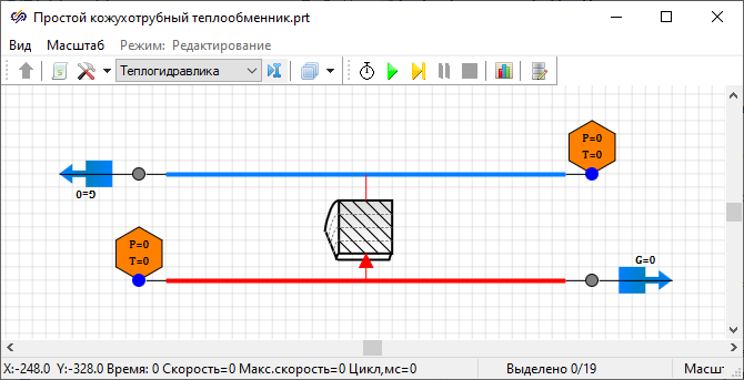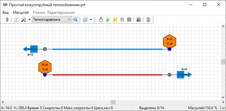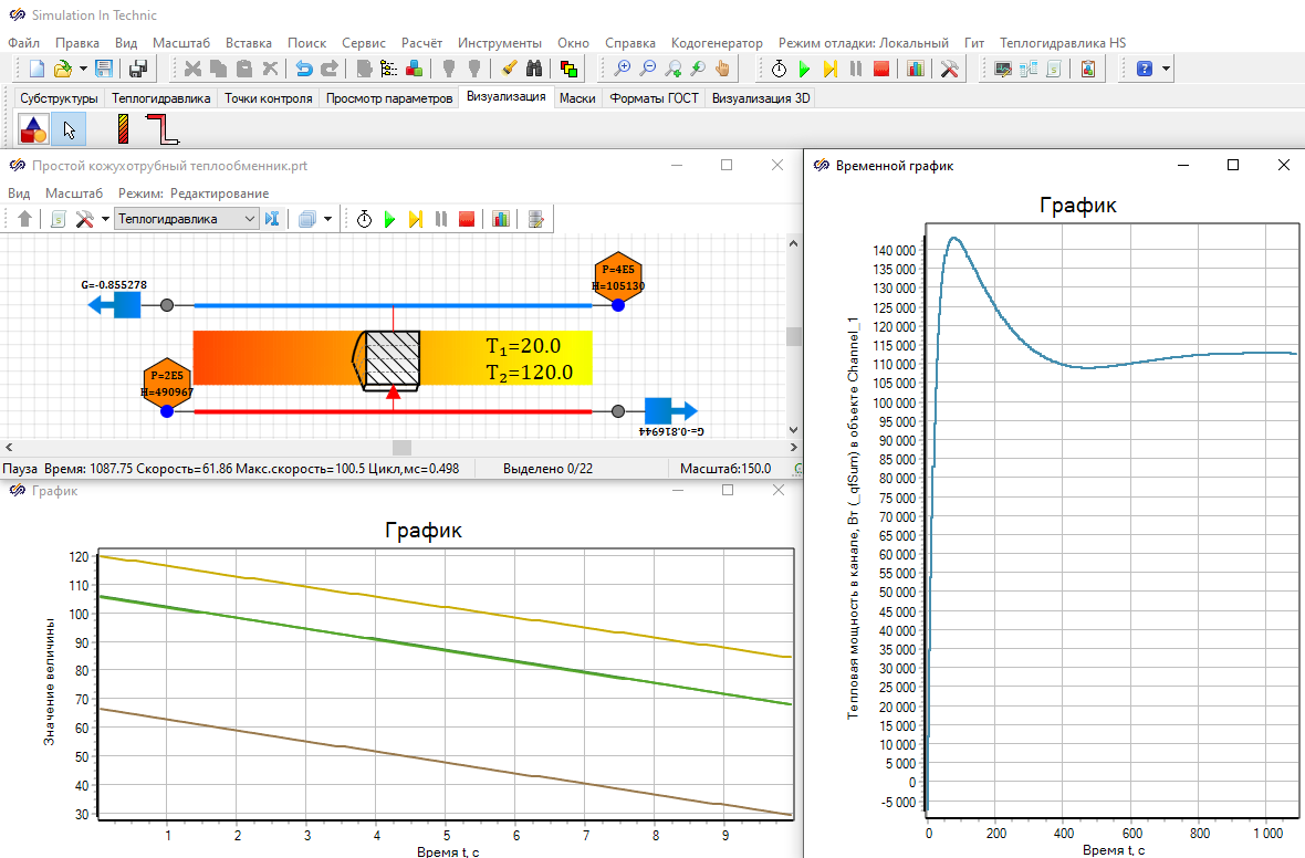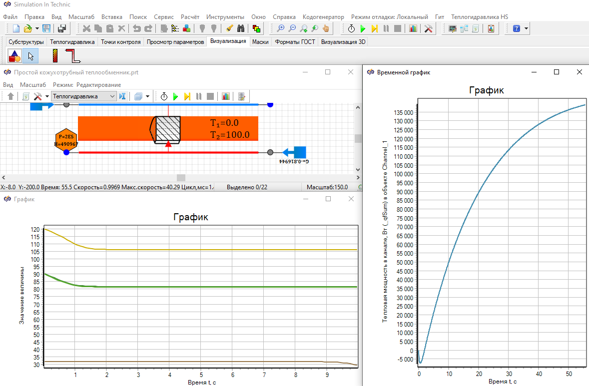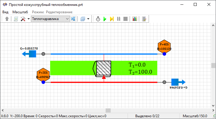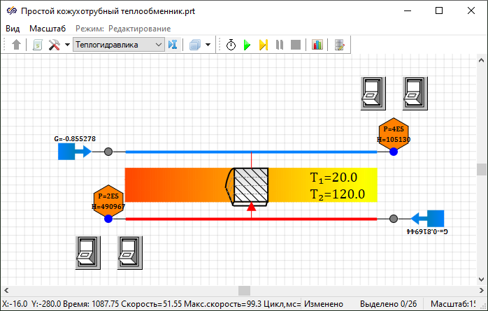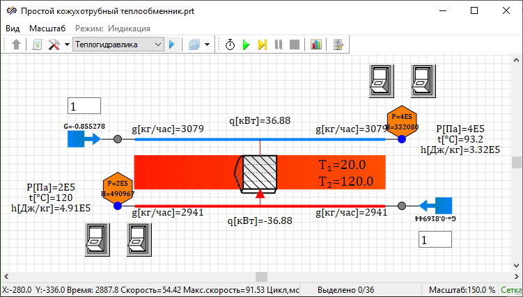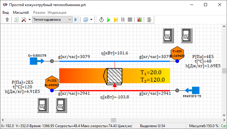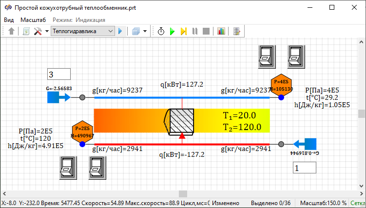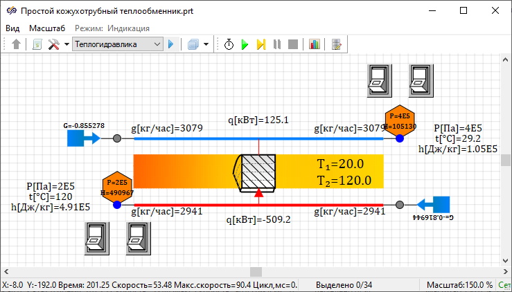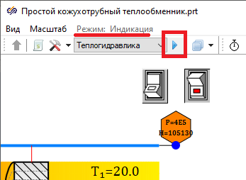 Запустив проект на расчет, можно изменять кнопками температуру теплоносителей и наблюдать результат на графиках и подписях схемы. При этом необходимо помнить, что изменять состояние кнопок можно только когда схема находится в режиме индикации.