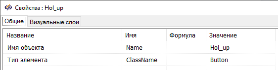 Левая кнопка возле каждого граничного узла будет увеличивать температуру вытекающего из него теплоносителя, а правая – уменьшать. Для удобства изменим имена кнопок в соответствие с их назначением. Сделать это можно на вкладке "Общие" в окне редактирования свойств каждой кнопки. Левую кнопку граничного узла холодной линии назовем "Hol_up", а правую "Hol_dn". Кнопки возле граничного узла горячей линии назовем соответственно "Gor_up" и "Gor_dn".