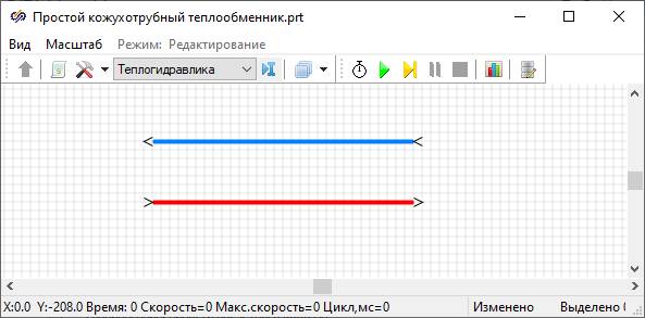 Создадим новый проект с помощью команды главного окна программы "Файл" → "Новый проект" → "Схема теплогидравлики". Горячую и холодные линии теплообменника будем моделировать с помощью блока "HS - Канал" из библиотеки блоков в главном окне программы. Расположим их на листе проекта, как показано на рисунке 1.