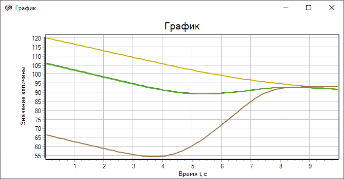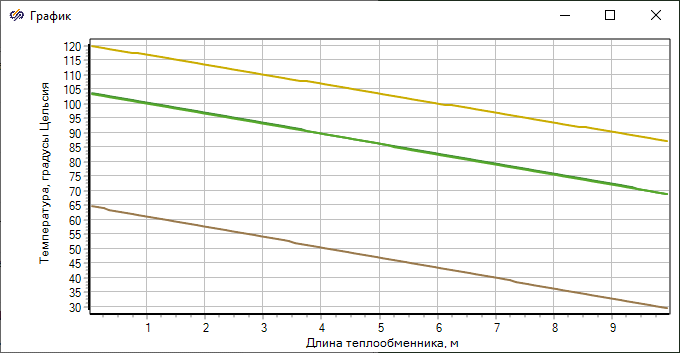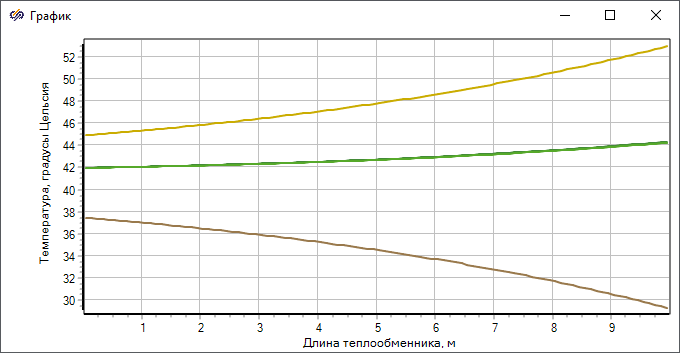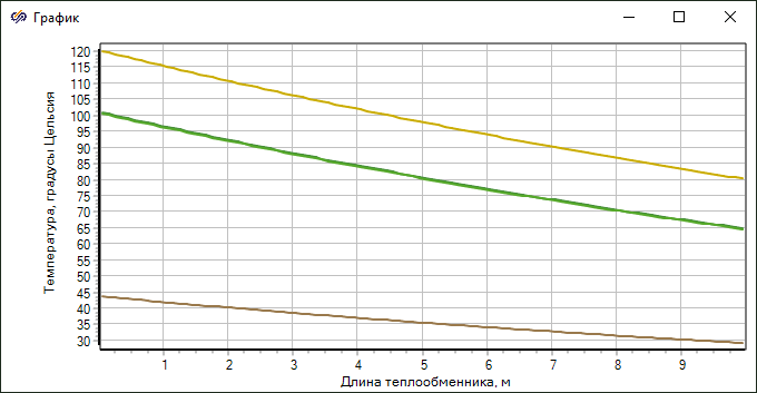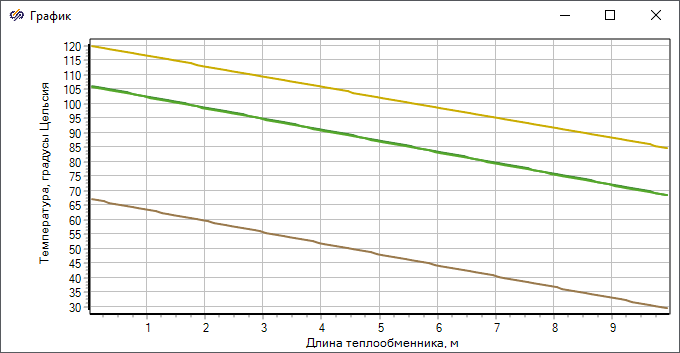 Форма распределения выровнялась, однако не стала столь же близкой к линейной, как при коэффициентах, равных 1. Падение температур горячей линии составило 57 градусов, а увеличение температуры холодной – 55 градусов. То есть при пропорциональном увеличении расходов теплоносителей, эффективность теплообмена снизилась, но возросла суммарная мощность теплообмена, за счет увеличения массового расхода теплоносителя. Таким образом, имея модель теплообменника, можно подобрать значения входных расходов так, чтобы обеспечивалась необходимая эффективность теплообмена, а также требуемый выходной расход.
