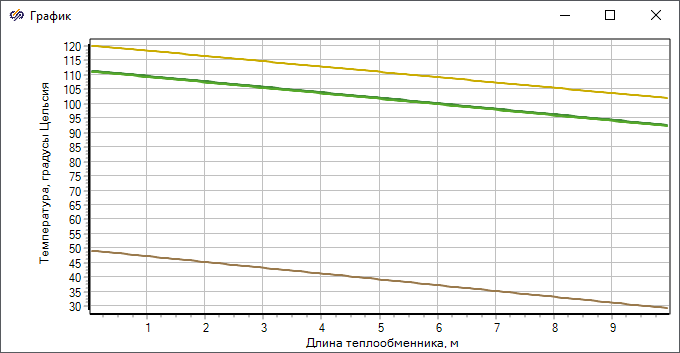 По обеим линиям теплоноситель начинает движение "с конца" теплообменника, то есть с правой части графика. Обе температуры близки друг к другу, поэтому по достижению противоположной части теплообменника, происходит их выравнивание.