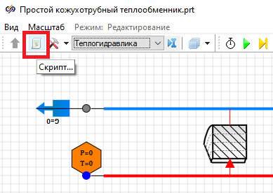 Кроме визуального состояния, при нажатии, кнопка изменяет еще и состояние своего двоичного параметра с именем "Down". Именно изменение параметра будет служить признаком состояния кнопки на программном уровне. Дополним скрипт проекта текстом, обеспечивающим увеличение либо уменьшение энтальпии теплоносителя, вытекающего из узла, в зависимости от того, какая кнопка нажата. Для обращения к параметрам, как и прежде, используется конструкция из имени блока и имени параметра, разделенных точкой.