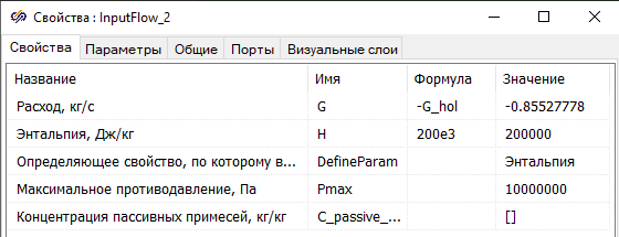 В секцию инициализации вошли все необходимые параметры для моделирования работы собранной теплогидравлической схемы. Привяжем их к свойствам конкретных блоков холодной магистрали с помощью окна свойств объекта, согласно рисункам 8, 9, 10 и 11. Отрицательное значение расхода подпитки в блоке "HS - Подпитка", обуславливается необходимостью обеспечения течения теплоносителя по направлению от граничного узла. При этом граничный узел моделирует входное давление на линии, а блок подпитки – расход через магистраль.