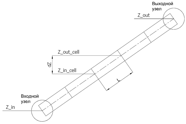 Для входного и выходного узла в свойствах блока задаются высотные отметки относительно некоторого общего для всей схемы нуля. В свойствах канала задаются перепады высоты для всех ячеек (положительное значение соответствует подъему, отрицательное – опускному участку). По этим значениям при инициализации схемы для всех ячеек всех каналов рассчитываются высотная отметка центра входного сечения ячейки (на рисунке – Z_in_cell) и высотная отметка центра выходного сечения ячейки (на рисунке Z_out_cell). Отсчет для первой ячейки начинается от высотной отметки входного узла Z_in. Для последней ячейки принимается Z_out = Z_out_cell (то есть значение последнего заданного в массиве Dz канала фактически игнорируется, а вместо этого высотный перепад для последней ячейки задается таким, чтобы высотная отметка центра ее выходного сечения точно соответствовала высотной отметки выходного узла).