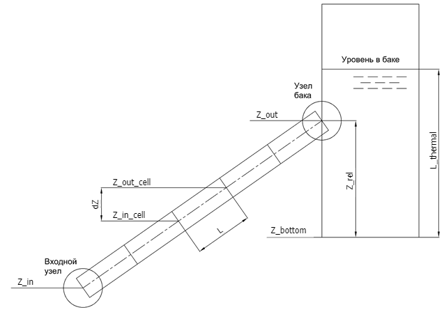 В свойствах узла бака задается высотная отметка расположения узла относительно днища бака Z_rel на рисунке). В коде она пересчитывается в абсолютное значение, исходя из заданной абсолютной высотной отметки днища бака (Z_bottom на рисунке). В узле бака при расчете давления при помощи добавки Plev учитывается превышение уровня в баке над узлом:
