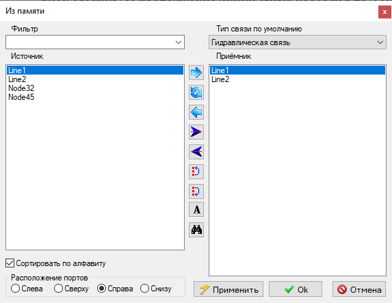 Блок организует продолжение линии связи, которая в другом месте схемы окончилась блоком В память, таким образом продолжая ее без явного проведения линии связи на схеме. Это бывает удобно, например, при создании сложных расчетных схем с разветвленными в пространстве трубопроводами, либо в случае организации одной расчетной схемы на нескольких листах.