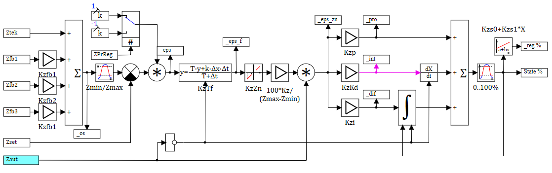 Сигналы функциональных обратных связей "Zfb1", "Zfb2", "Zfb3" со своими весовыми коэффициентами "Kzfb1", "Kzfb2", "Kzfb3" складываются с сигналом регулируемого параметра "Ztek". В результате получаем сигнал обратной связи "_os", который ограничивается снизу и сверху заданными пределами изменения регулируемого параметра "Zmin", "Zmax".