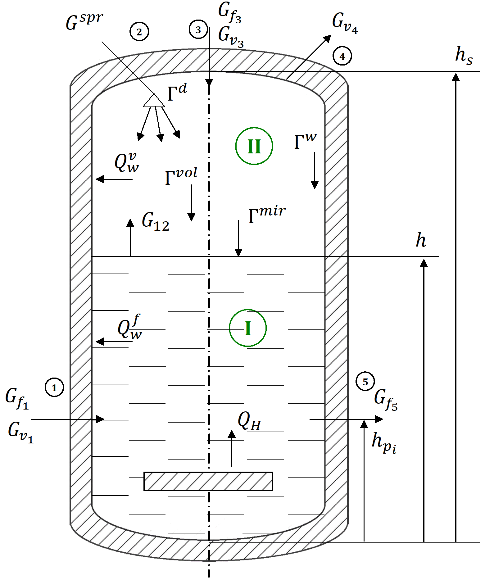 ГН, Гmir, Гw, Гvol, Гd - интенсивность конденсации пара на нагревателях, зеркале жидкости, на стенке, в объеме пара и на струях впрыска соответственно [кг/с];