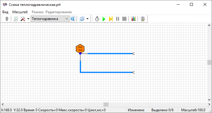 В данном примере блок "Граничный узел" будет удерживать заданное давление в данной точке расчетной схемы. В процессе расчета допустимо задание новых значений давления в граничном узле, либо задание давления через сигнал проекта, путем изменения значения сигнала. Следует избегать сильных изменений давления в граничном узле для устойчивости расчетной схемы.