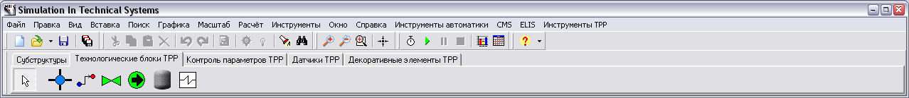 Система графического интерфейса для кода TPP входит в штатную поставку SimInTech. После запуска SimInTech элементы теплогидравлического кода TPP помещаются в соответствующую закладку "TPP" общей палитры элементов SimInTech (см. Рис. 1).