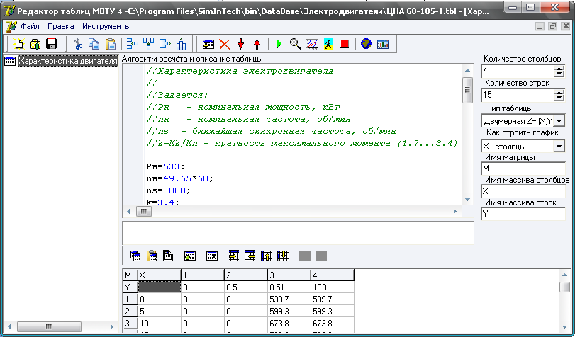 После этого появится "Редактор таблиц" с загруженным файлом свойств редактируемого элемента (см. Рис. 4). Для электродвигателя необходимо задать одну таблицу с характеристиками.