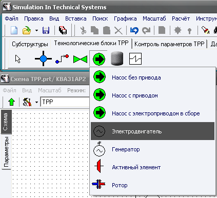 Для моделирования электропривода насоса используется элемент Электродвигатель. Данный расчетный блок находится в закладке "Технологические блоки" (см. Рис. 1).
