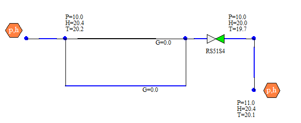 На рисунке ниже изображена часть гидравлической системы, в которой существует перепада давления между левой границей P1 =10 атм. и правой границей P2 = 11 атм. Обратный клапан препятствует отрицательному расходу через систему.