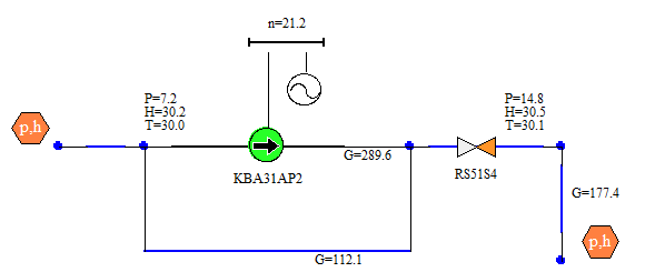 Рекомендуется задавать линию рециркуляции, параллельную насосу. В больших насосах такая линия является технологически обязательной. В малых насосах такой линией являются паразитные протечки. Наличие линии рециркуляции существенно повышает численную устойчивость программы. Протечки, как правило, составляют 1 - 2 % номинального расхода при номинальном давлении. Гидравлический канал рециркуляции рассчитывается исходя из указанных характеристик.
