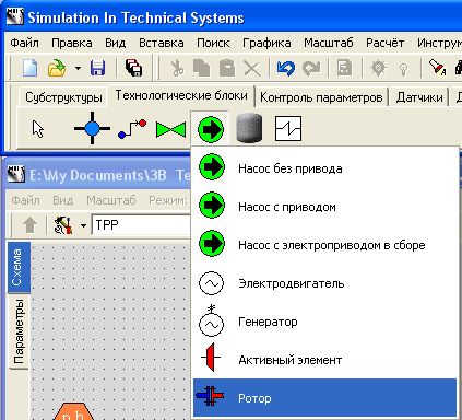 Ротор, помещенный на схему, может быть подключен к нескольким активным элементам для моделирования передачи механической энергии. Для моделирования электронасоса необходимо подключить к одному ротору насос с приводом и электродвигатель.