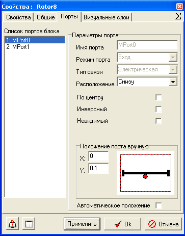 По умолчанию ротор содержит два порта для подключения механической связи расположенные внизу элемента. Для изменения расположения порта необходимо воспользоваться закладкой. "Порты" диалогового окна "Свойства элемента" (см. Рис. 2).