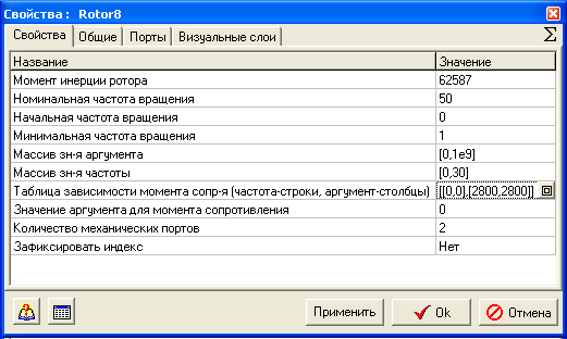 - Таблица зависимости момента сопротивления (частота - строки, в данной версии SimInTech (но не ТРР-6) столбцы не задействованы (в качестве аргумента по умолчанию принято время моделирования физического процесса, либо рассчитываемой в SimInTech переменной), следует указать аргумент в виде двух параметров от 0 до 1.0*109) – зависимость, заданная в табличном виде для определения момента сопротивления ротора по частоте и времени.