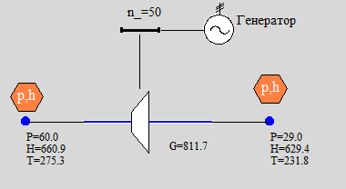 Значение снимаемой мощности, при работе на номинальных оборотах определяется разностью энтальпии теплоносителя на входе и выходе в канал и моментов сопротивления трения заданной для ротора турбины и активного элемента.